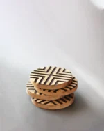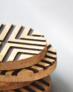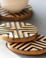 The product includes a set of four wooden coasters. Crafted with care and love, these coasters will add a twist of natural charm to your drink experience. Perfect to use in bar or living room accessories.