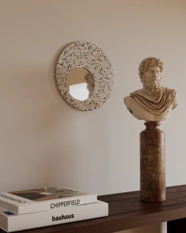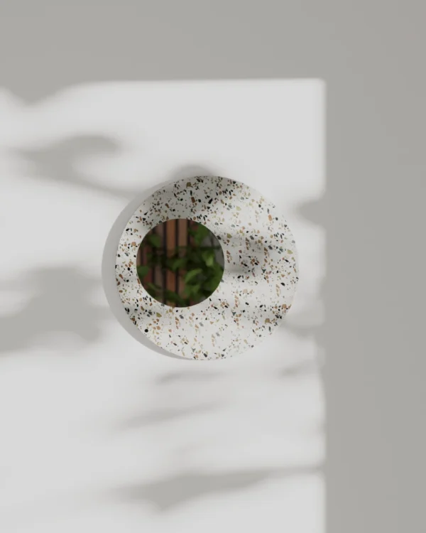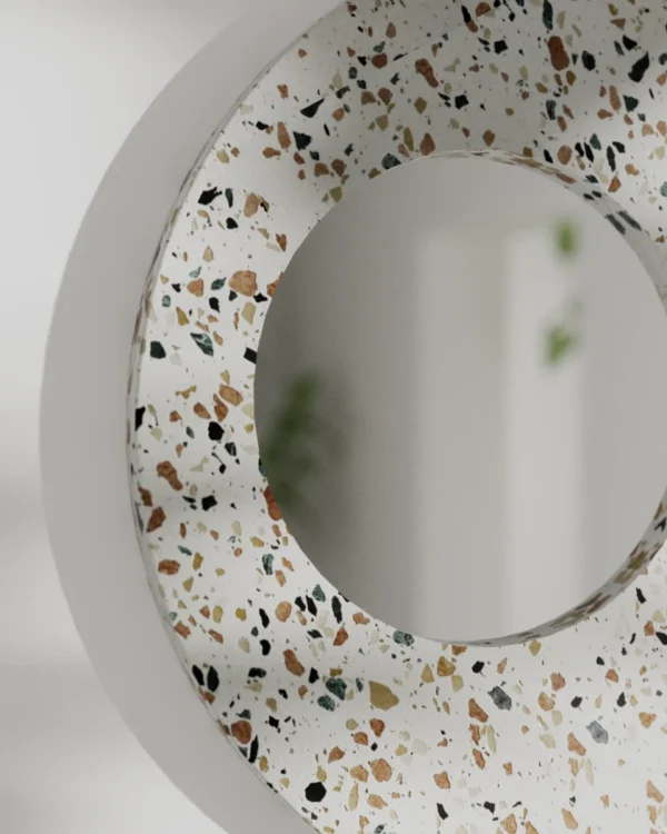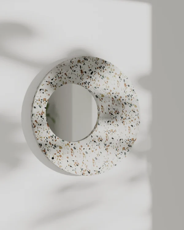 Experience aquatic vibes with this terrazzo mirror frame. A perfect addition to any room of your home, this white colour finish and the shape is what steals the show. It is a beautiful play of texture and forms. A perfect example of how beautiful can a piece of Mirror become.