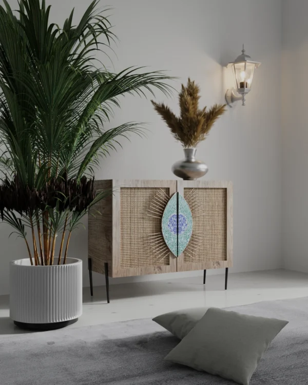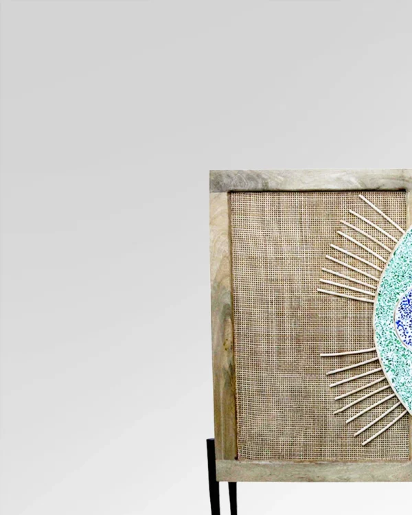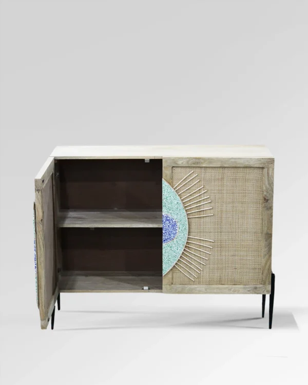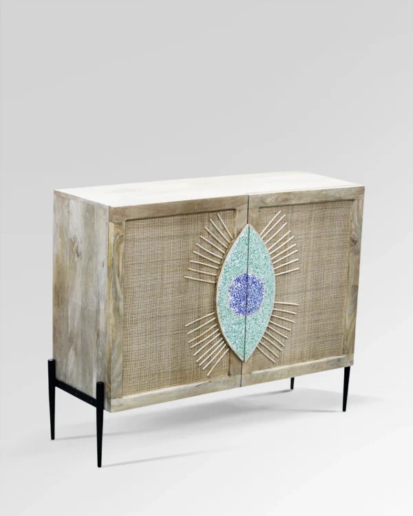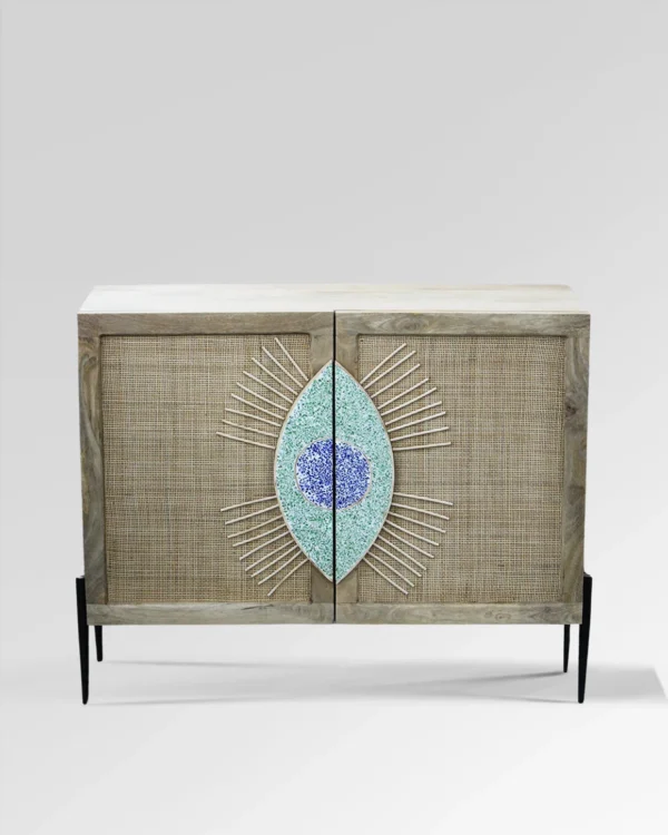 This cabinet from Mango Trunk features cut out rattan sheeting with vibrant color terrazzo handles for stylish storage pieces that add a splash of color to your home. Standing atop small iron legs, this cabinet has one big shelve inside to organize your bedtime essentials. Get yours today at Mango Trunk!